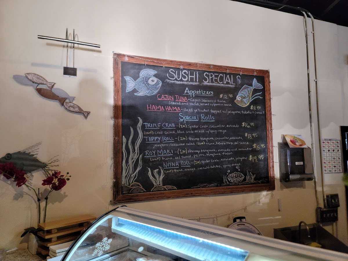 Inside: tuna, yellowtail, salmon, jalapeno, avocado and cucumber. Outside: wasabi tokiko, cilantro, and wasabi mayo.